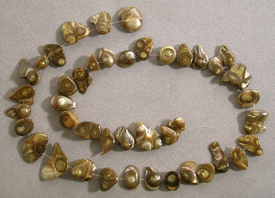 Beads from blistered pearl and abalone shell with nice irridescence and a golden honey brown hue. The nodules or orbs are pearls that formed inside the abalone shell. We have one other strand of abalone shell pieces this size.