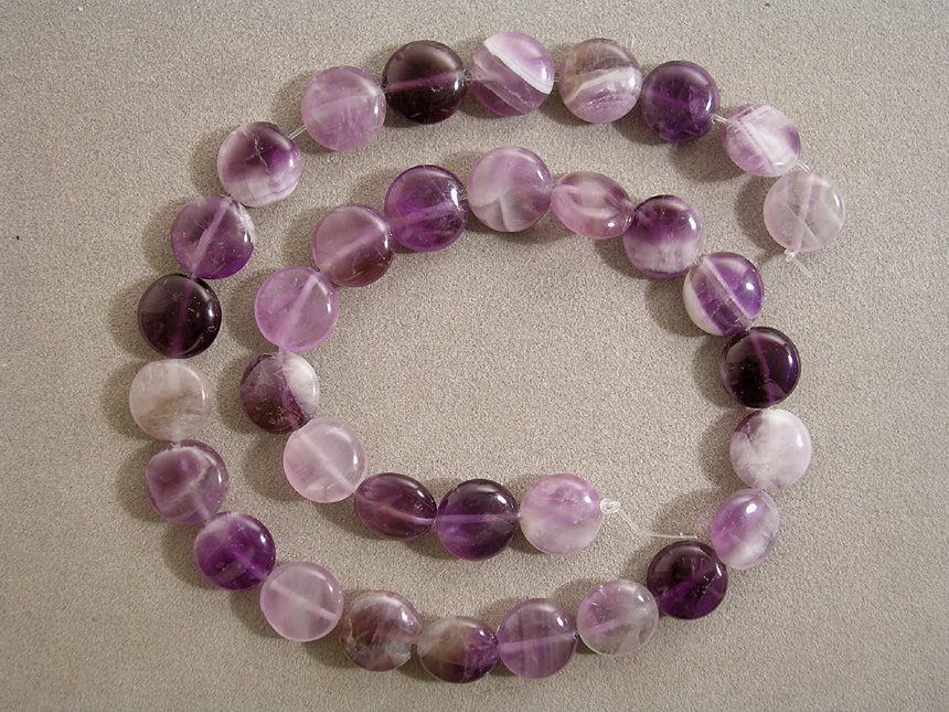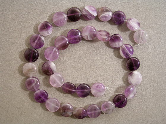 Supersize Amethyst coin beads in several shades that are rounded and thickest in the center.
