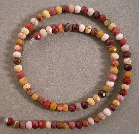 Supersize These small Mookaite jasper rondelle beads have tan, burgundy, lavender and ivory colors that are typical of this mineral.