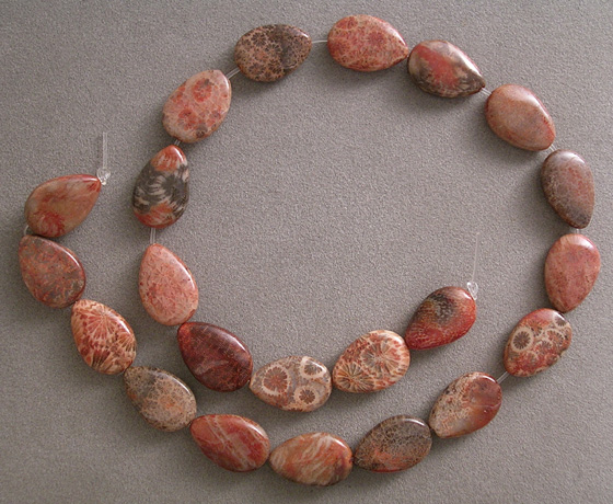 Fossilized coral teardrop beads Catalog 1872 15.5 in. 18 x 13mm 188 carats $18 |