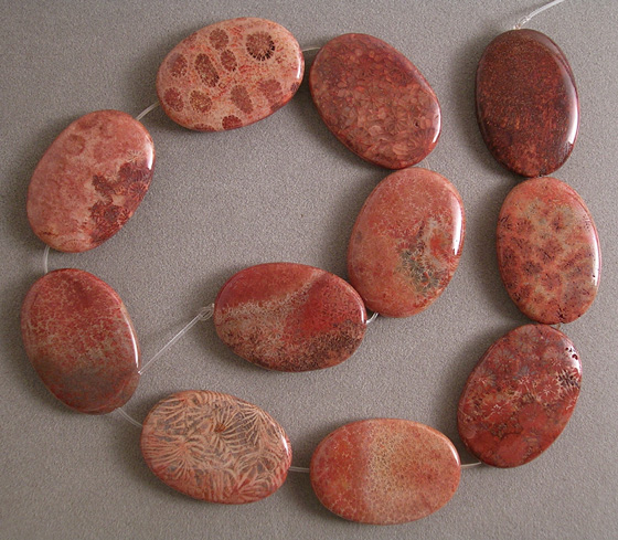 Fossilized coral oval beads Catalog 1874 15 in. 35 x 25mm 507 carats $28(SOLD) |