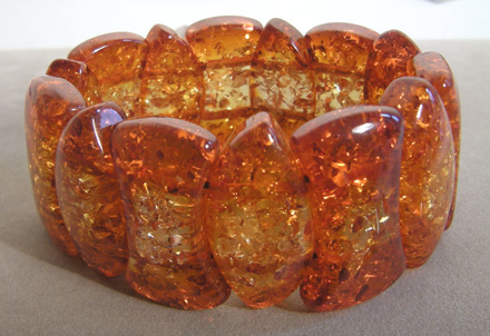 ![]() Interlocking amber beads on elastic cord for bracelet. The elastic cord is OK for temporary use but we recommend restringing. |