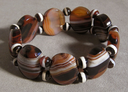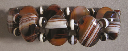 ![]() ![]() Brown and white agate oval beads with some red. Strung on temporary elastic band with spacer beads. Recommend to be restrung for everyday use. |