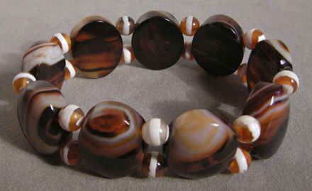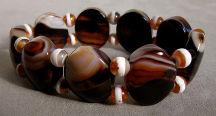 ![]() ![]() Brown and red agate ovals with spacer beads strung on temporary elastic band. |