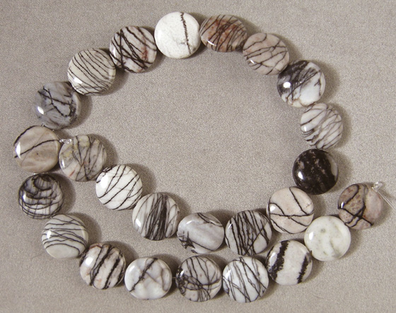 Zebra jasper disc beads Catalog 2044 15.5 in. 16 x 6mm 289 carats $18(SOLD) |