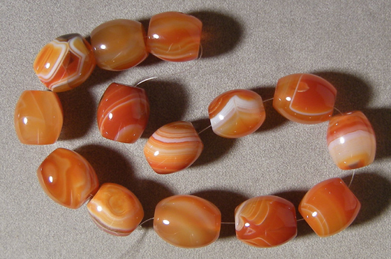 Red/white agate barrel beads Catalog 2101 9 in. 15 x 14mm to 19 x 15mm 347 carats $38(SOLD) |