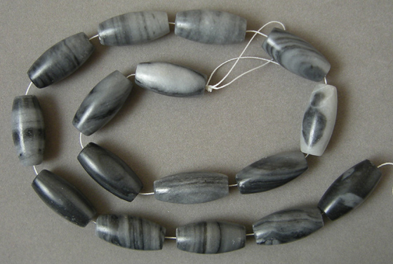 Zebra jasper barrel beads Catalog 2200 16 in. 25 x 12mm 487 carats $29(SOLD) |