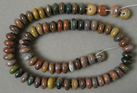 Multi colored jasper rondelle beads Catalog 2207 15.5 in. 11 x 5mm 303 carats $19(SOLD) |