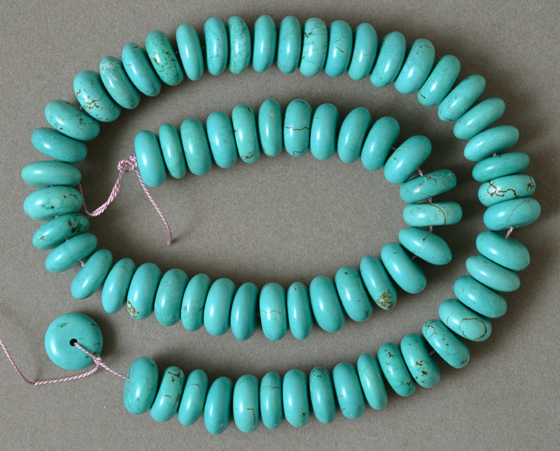 Turquoise disc beads Catalog 2277 16 in. 13 x 5mm 591 carats $38(SOLD) |