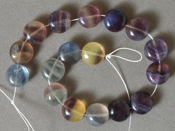 Rainbow fluorite round beads Catalog 2310 8 in. 12 x 6mm 145 carats $21(SOLD) |