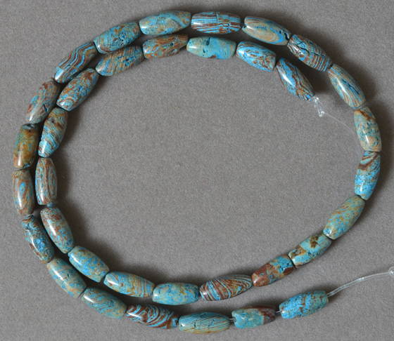 Rainbow calsilica barrel beads Catalog 2352 15.5 in. 10 to 12mm long x 5mm 84 carats $15(SOLD) |