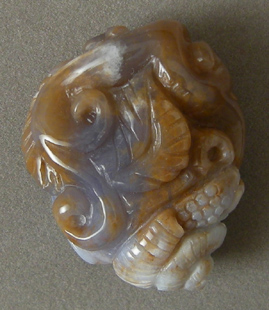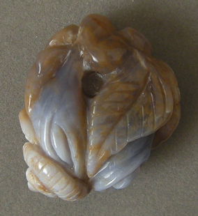 ![]() Carving of snail for pendant bead from blue yellow agate with some red. |