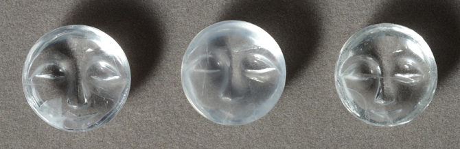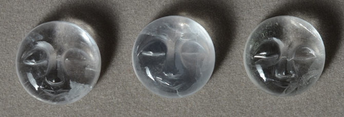 | Three round faces carved from Himalayan quartz. | |