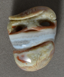 | Carved bird pendant from tan, blue and red South African zebra agate. | |