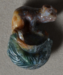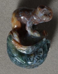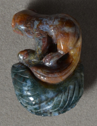 Carving of a`small animal from green, brown and blue Indian moss agate. Loop at top for use as pendant. |