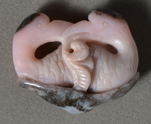 | Peruvian pink opal carving of two birds. Hole on top for pendant use. | |