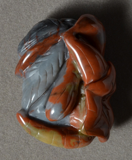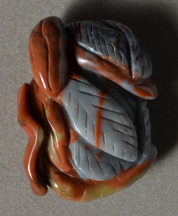 | Red and grey carving of plants from Brazilian multi color agate. Hole at top for pendant use. | |