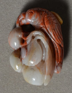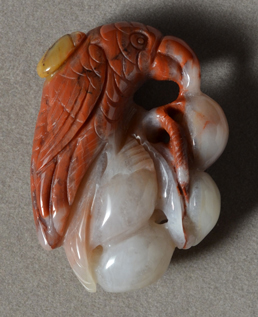 | Parrot pendant carved from red, white and yellow Brazilian agate. | |
