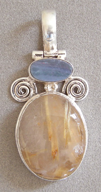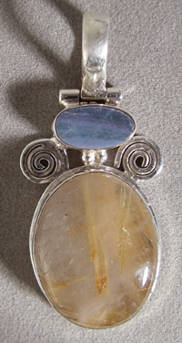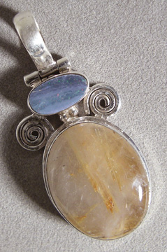Rutilated quartz and opal pendant Catalog 7041 Silver pendant with two cabochons 26 x 20 x 7mm focal piece 90 carats total $28 |