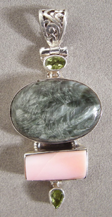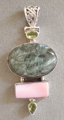 ![]() The focal piece in this pendant is a seraphinite oval cabochon. The small rectangle cabochon is coral and the tiny stones peridot. |