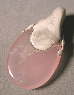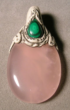 This rose quartz is set with silver clay and a malachite stone above it. | |